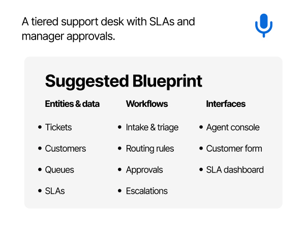 SuperSoft uses AI to understand your domain language—queues, SLAs, approvals, regions, segments—and turns it into systems that are ready for production. Instead of wiring tools together by hand, you describe outcomes; SuperSoft composes the modules.