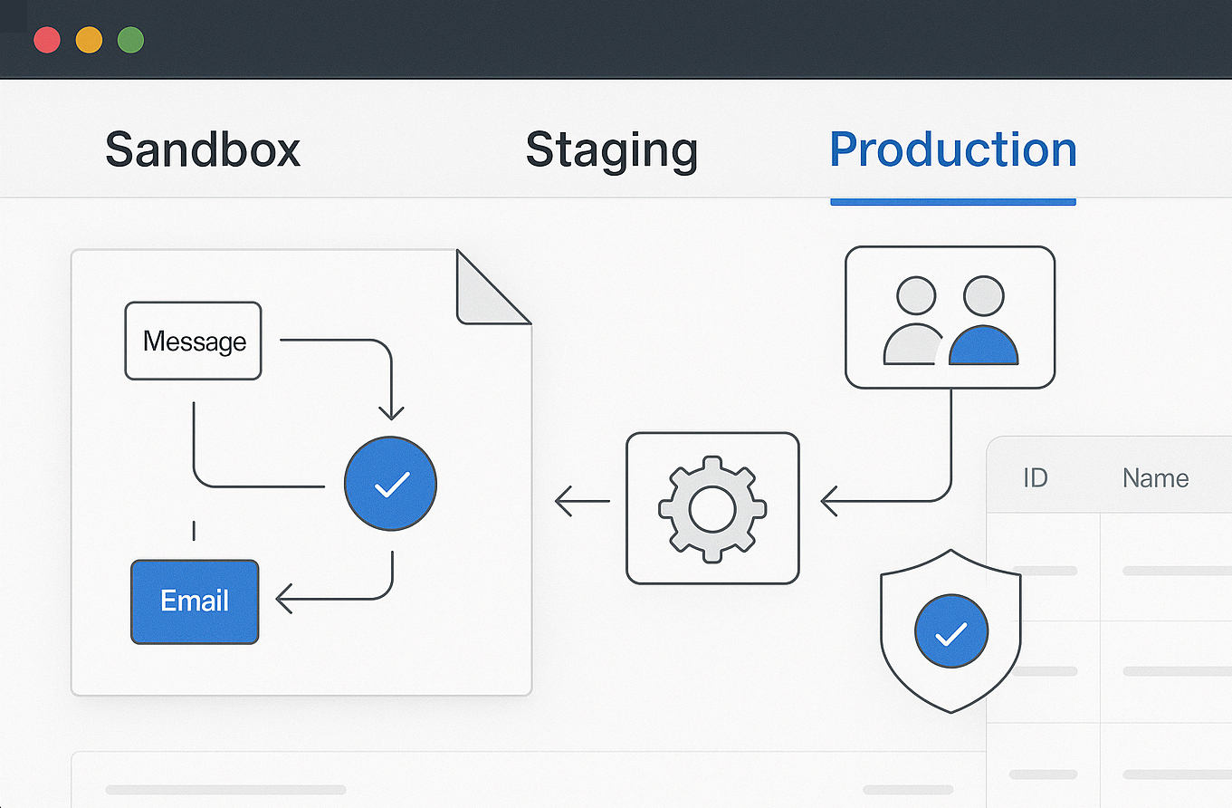 Move from sandbox to staging to production and choose whether to launch to a subset of teams, regions, or customers first.