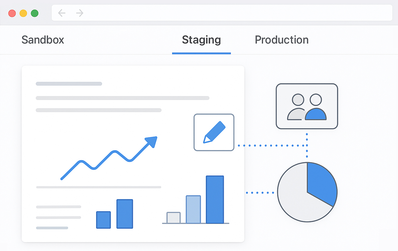 Move from sandbox to staging to production and choose whether to launch to a subset of teams, regions, or customers first.